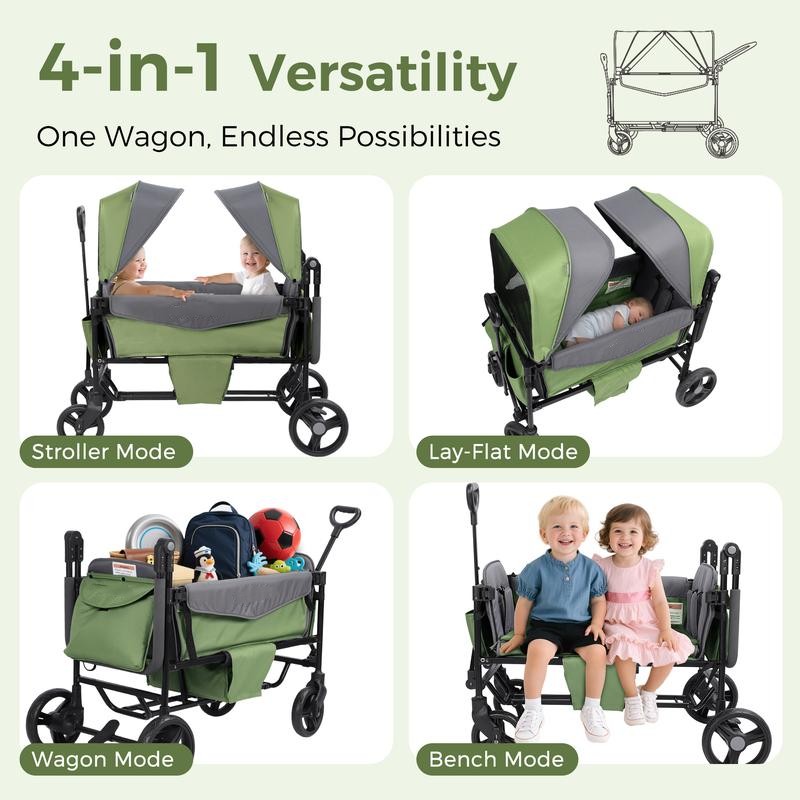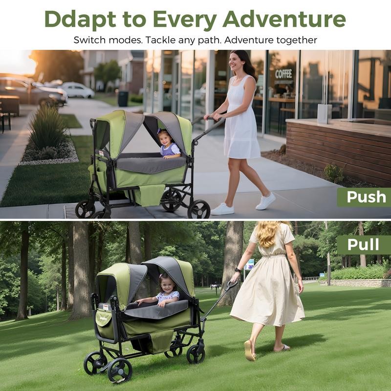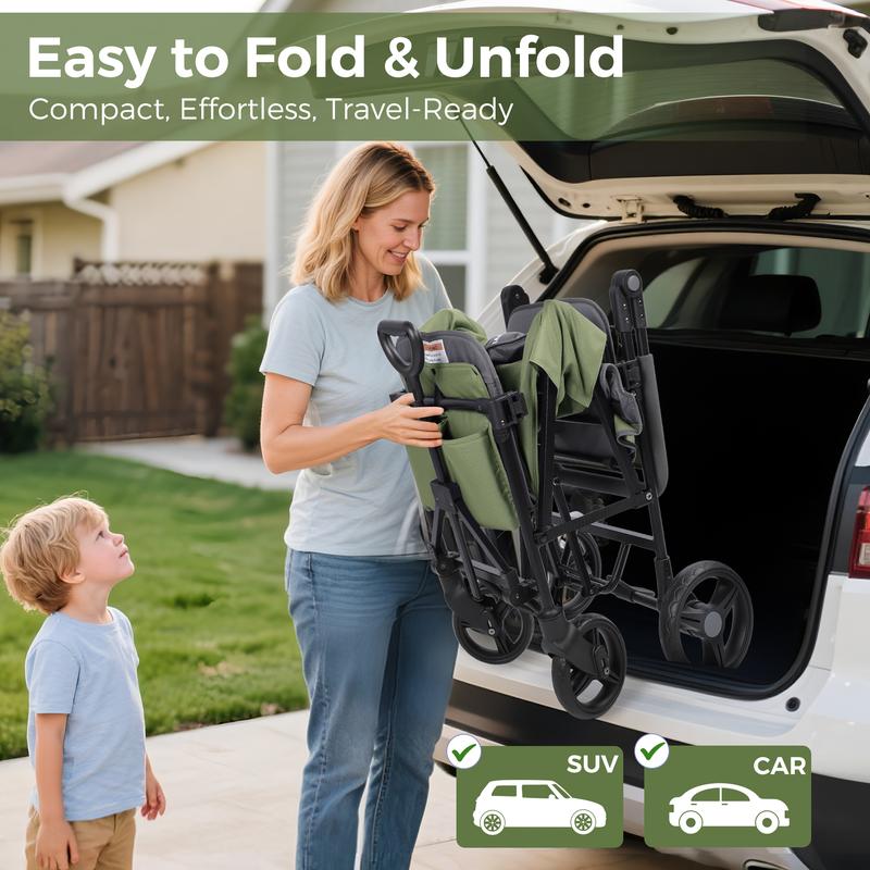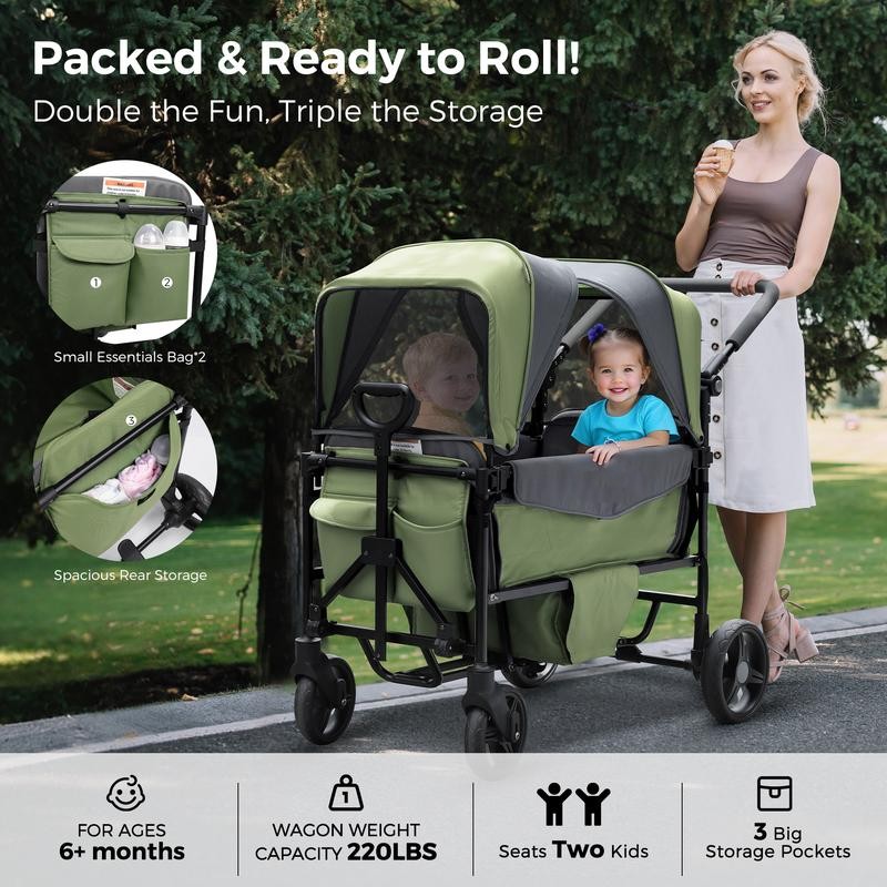 Momfann Stroller Wagon fits family park trips, beach days, zoo visits, or neighborhood walks with two young children. Parents appreciate push/pull versatility for varied terrain, while storage handles diaper bags and snacks. Travel-friendly folding suits car trips or vacations needing lightweight double transport.