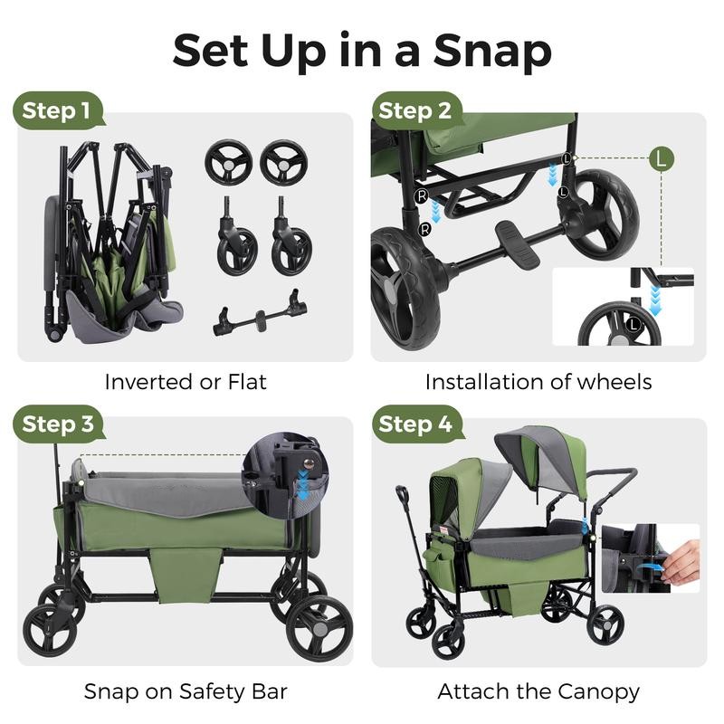 2 Seater All Terrain Stroller Wagon With Canopy For Baby combines wagon versatility with stroller safety at an accessible pricing versus brands. All-terrain wheels outperform standard strollers on uneven ground while removable seats enable flat-bed napping. Ample storage eliminates the need for extra bags, and dual-mode (push/pull) adapts to any outing. Compact fold beats bulky doubles for urban storage.