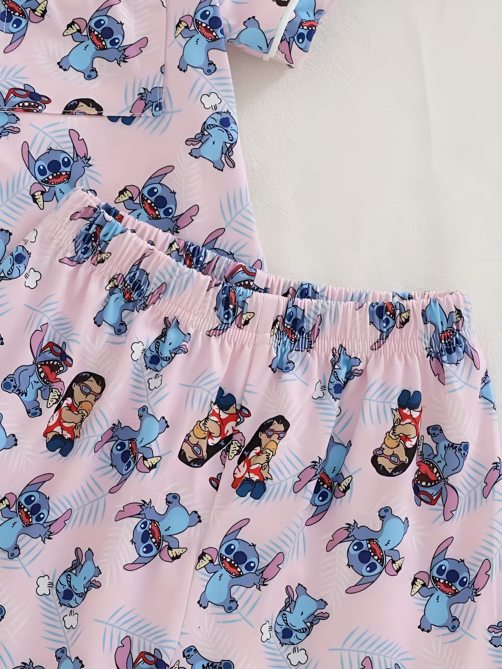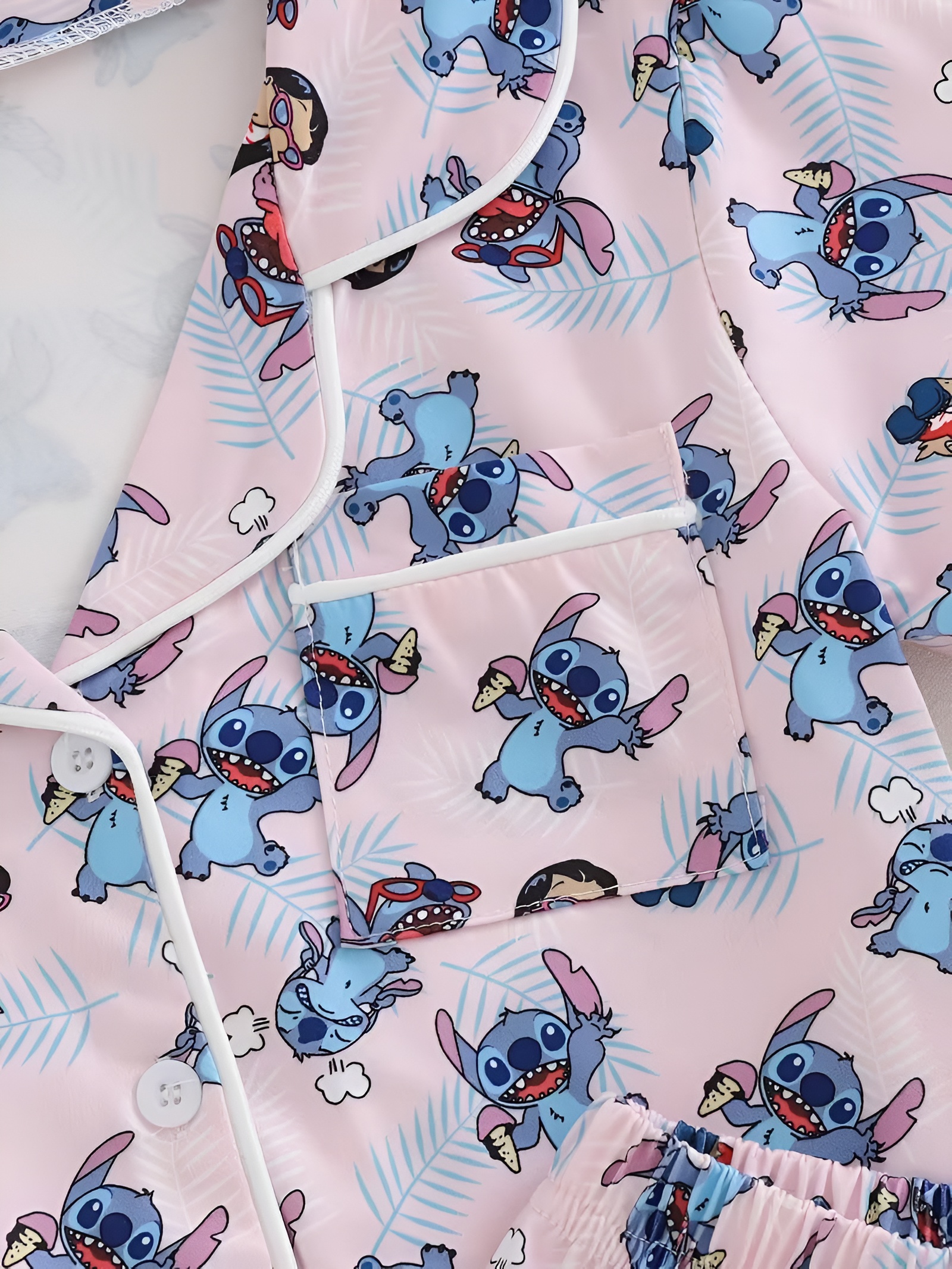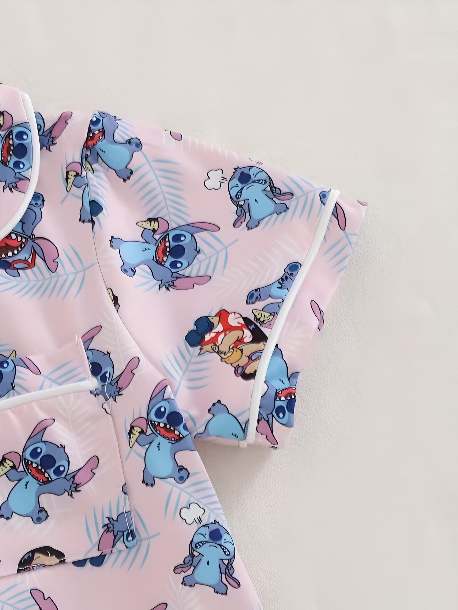 The Character Print Kids Button Pajama Set is designed for children who enjoy bright printed designs arranged in a warm-season outfit. This two-piece set features a button-front short-sleeve top and matching shorts, both created with a character-inspired pattern displayed across the fabric. The top includes a structured collar and smooth edge piping that contribute to a neat appearance suitable for everyday indoor routines.
