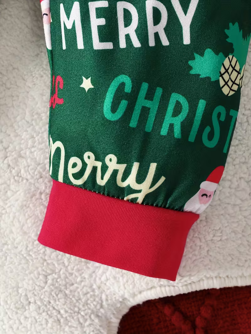 The matching pants continue the holiday theme with an all-over Christmas print. They include red ribbed cuffs and a comfortable waistband that stays reassured without tightness. The lightweight polyester-blend fabric maintains softness while supporting ease of movement during crawling, sitting, or early steps. The patterned design creates a lively appearance that pairs well with seasonal accessories and winter outerwear.