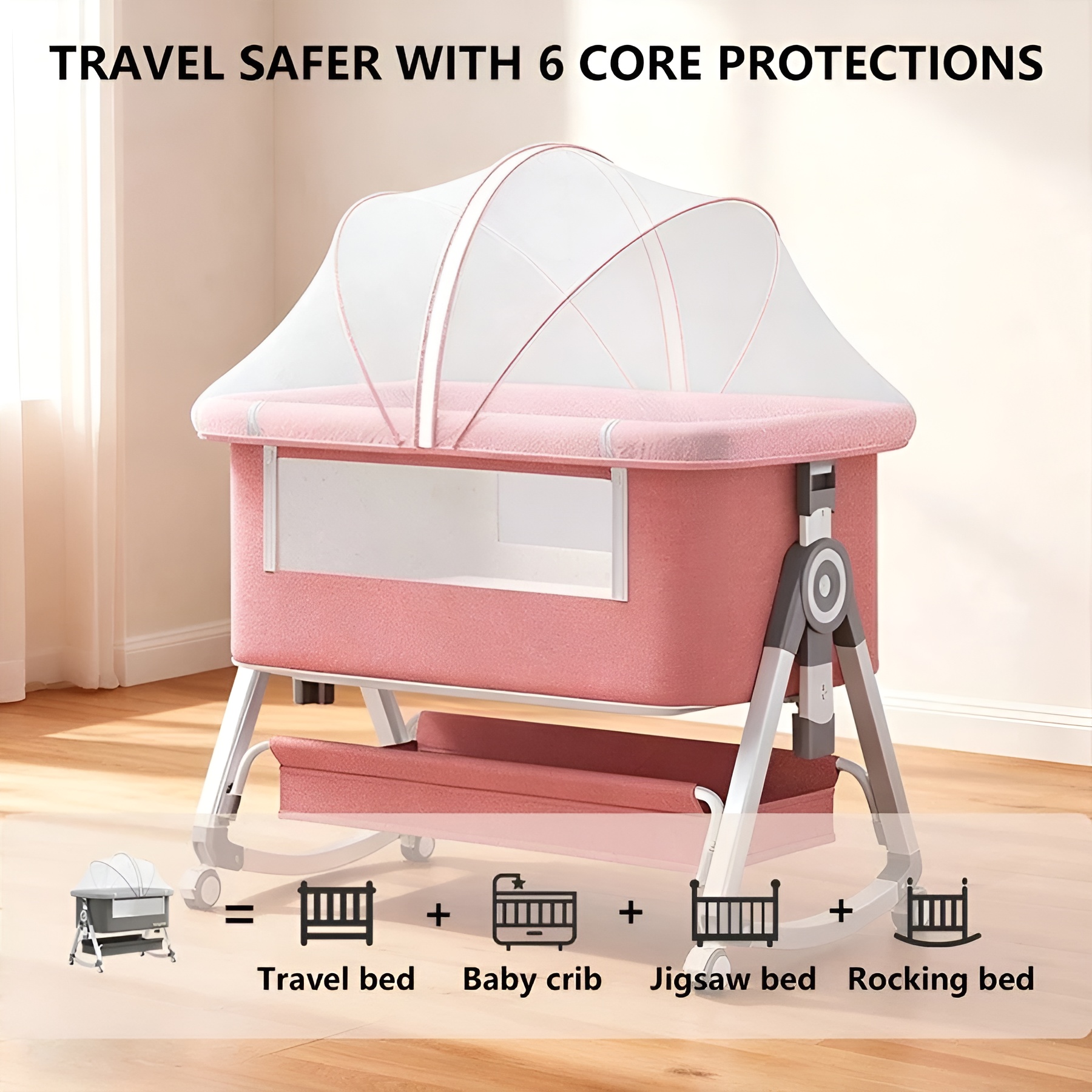 - 4-in-1 Design: Functions as a bassinet, bedside sleeper, portable crib, and includes a rocking mode for adaptability.