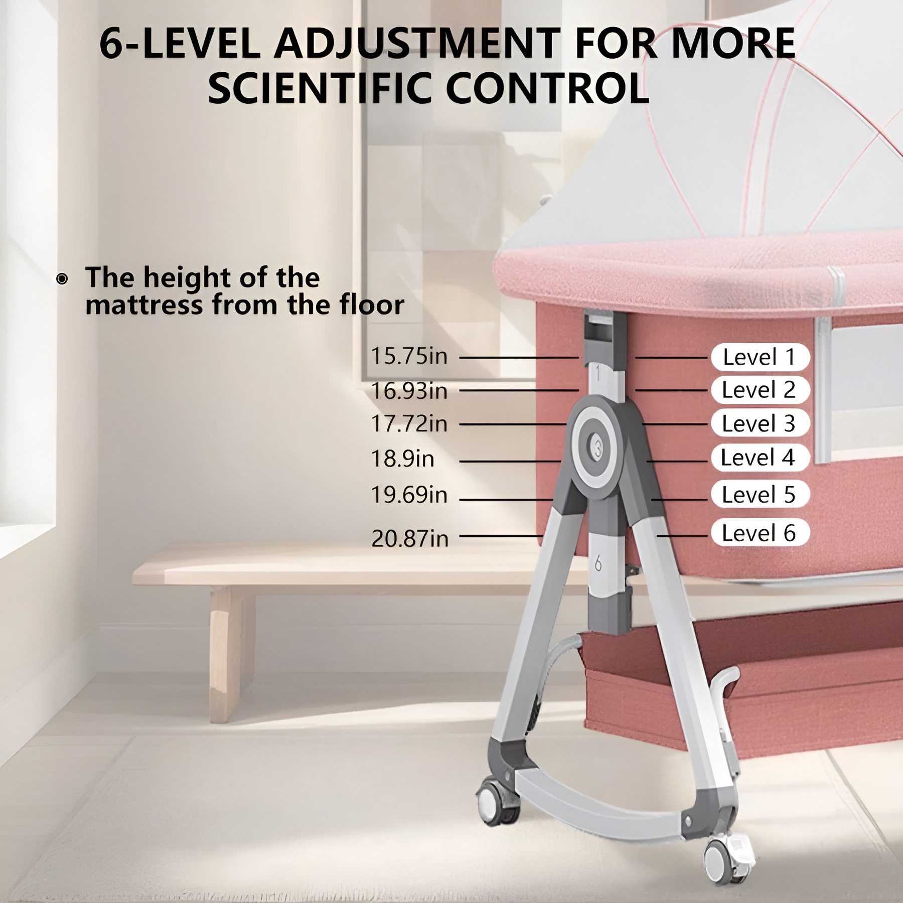 The product's practicality extends to its operational features, including robust wheels that enable smooth relocation and a height adjustment mechanism for aligning with various bed frames. The removable mosquito net offers an added layer of utility, making it suitable for different environments. This combination of features ensures a high degree of usability across various scenarios.