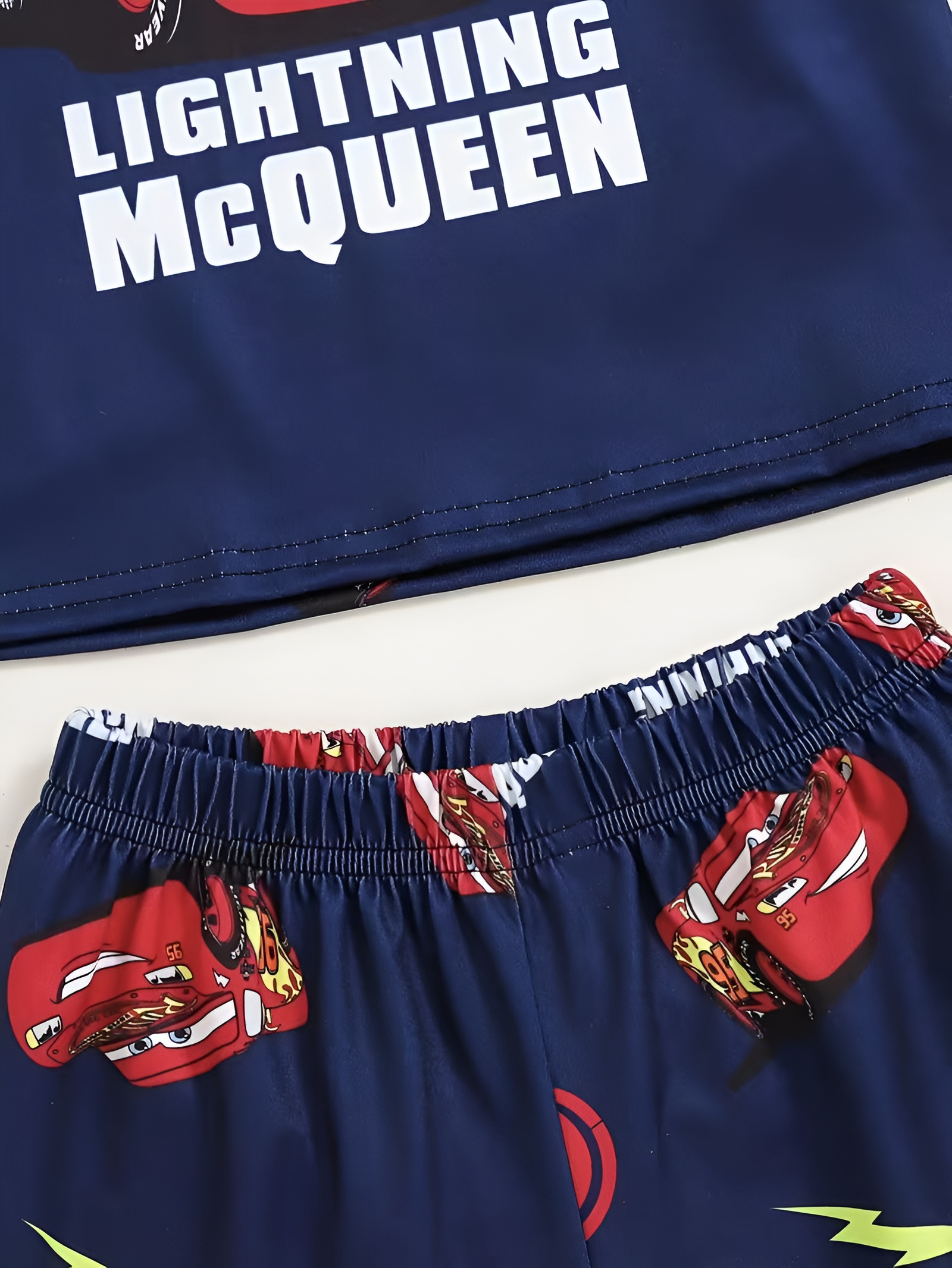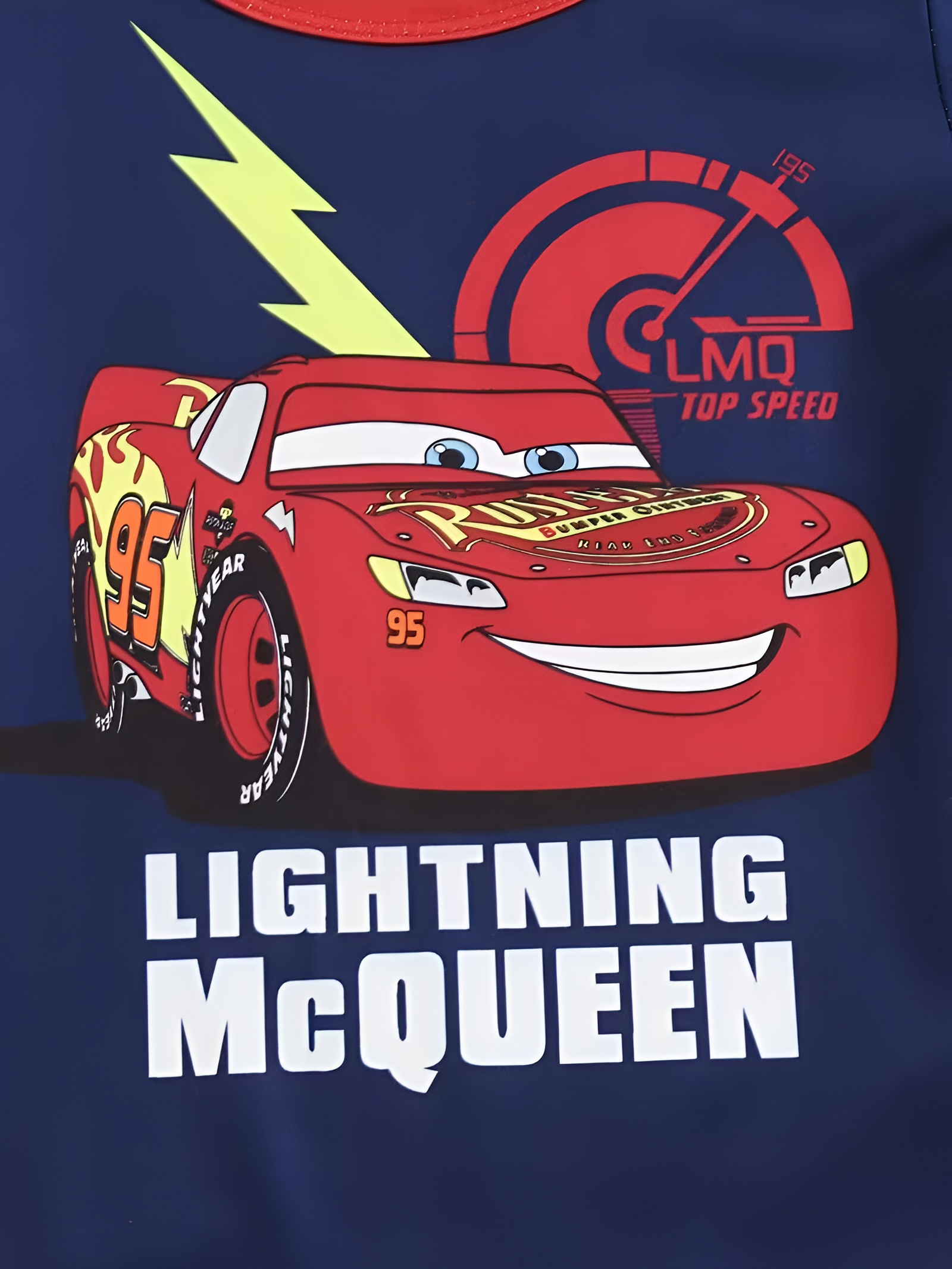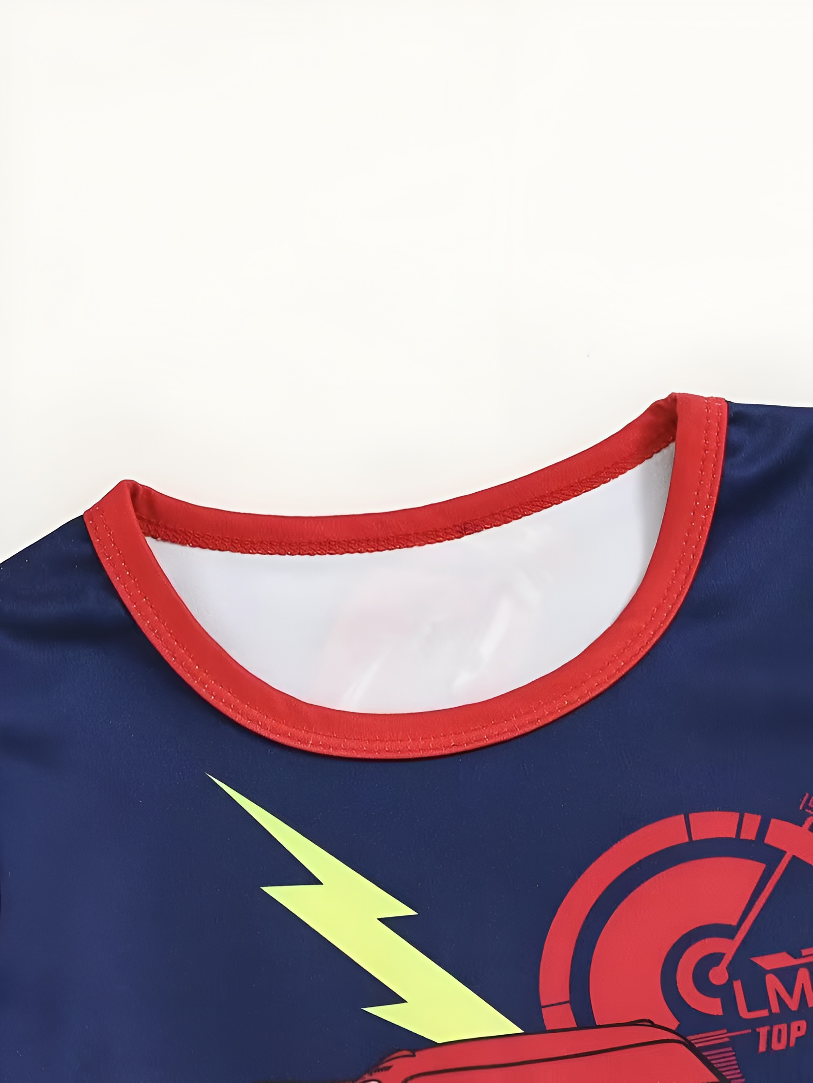 The design is intended for children twelve and under and fits easily into everyday wardrobes. The outfit provides consistent coverage for warm temperatures while offering a visually engaging look that appeals to children who prefer dynamic, vehicle-themed prints.